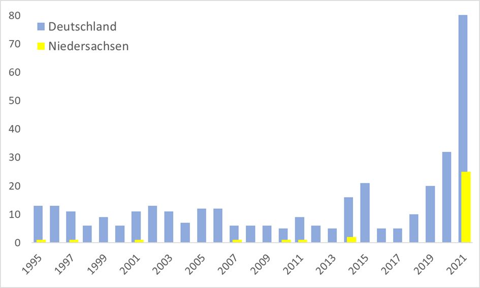 Die ebenfalls bei Forellen vorkommende Seuche IHN weist im Durchschnitt eine deutlich geringere jährliche Inzidenz im Vergleich zu VHS auf. In den Jahren 2018 bis 2020 wurden in Niedersachsen keine Ausbrücke dieser Fischseuche verzeichnet. Aufgrund eines weitgreifenden Seuchengeschehens in 2021 wurde ein starker Anstieg der Fallzahlen in diesem Jahr verzeichnet (Abbildung 2).