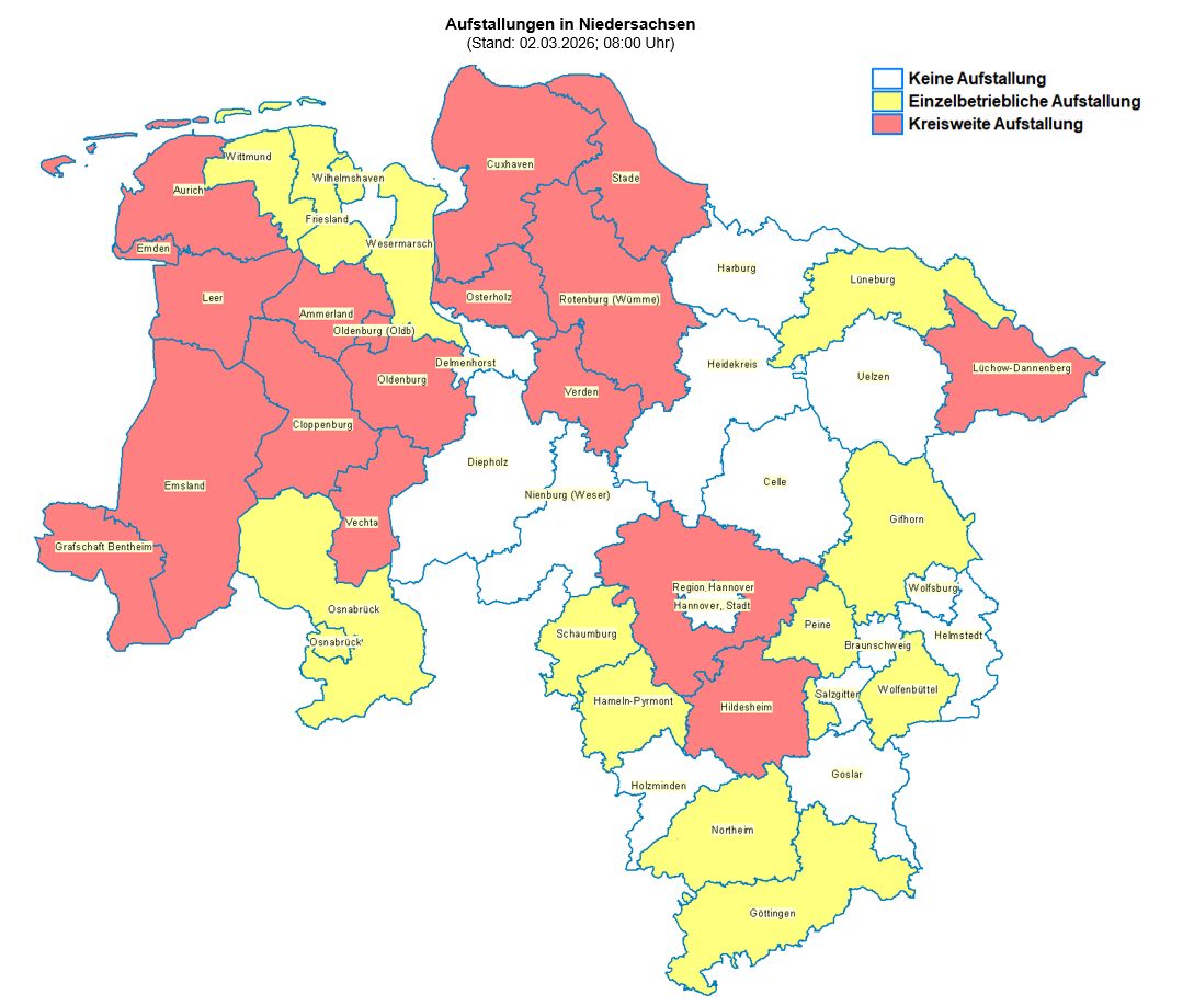 Aufstallungen in Niedersachsen (Stand: 02.03.2026, 08:00 Uhr)