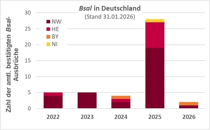Im Jahr 2025 ist ein starker Anstieg der Bsal-Meldungen zu verzeichnen. Betroffen sind aktuell die Länder Bayern (BY), Hessen (HE), Nordrhein-Westfalen (NW) und Niedersachsen (NI).