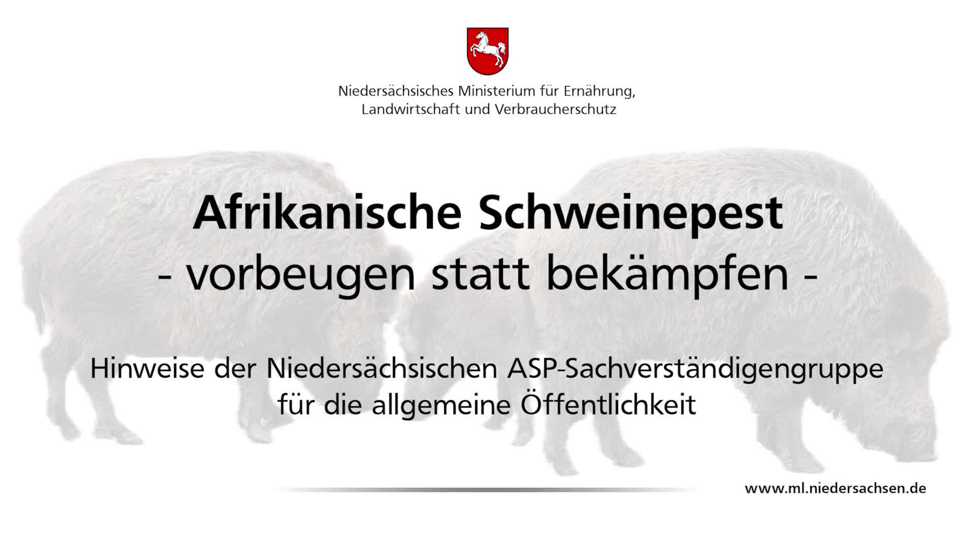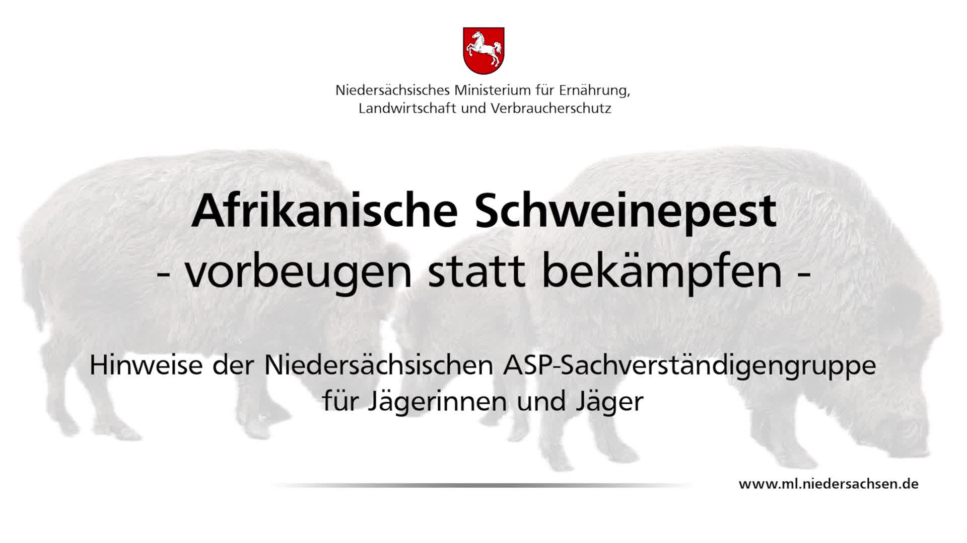 Um auf die Gefahren der ASP hinzuweisen, hat die Niedersächsische ASP-Sachverständigengruppe die Erstellung von Aufklärungsvideos in Auftrag gegeben, um breite Öffentlichkeit und insbesondere Jägerinnen und Jäger sowie Landwirtinnen und Landwirte für die Thematik zu sensibilisieren und auf präventive Maßnahmen hinzuweisen.