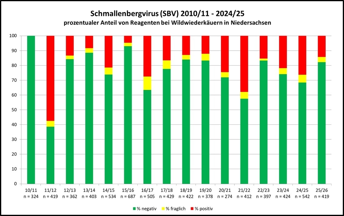 Nach einer hohen Erstinfektionsrate im Jagdjahr 2011/2012 konnten jeweils in den Jagdjahren 2014/2015 und 2016/2017 verstärkte Antikörpernachweise geführt werden. Die Nachweise von Antikörpern ab dem Jagdjahr 2017/2018 waren leicht rückläufig, so dass in diesem Zeitraum ebenfalls von einer rückläufigen Virusaktivität bzw. Viruszirkulation ausgegangen werden kann. Im Jagdjahr 2020/2021 wurde der zweithöchste Anteil positiver Proben von 37,9% beobachtet. Im Jagdjahr 2025/2026 lag die Nachweisrate bei 14,3 %. Der im Verlauf der Jahre wechselnde Reagentenanteil lässt den Schluss zu, dass das Schmallenberg Virus nach wie vor in der Wildtierpopulation aktiv ist.